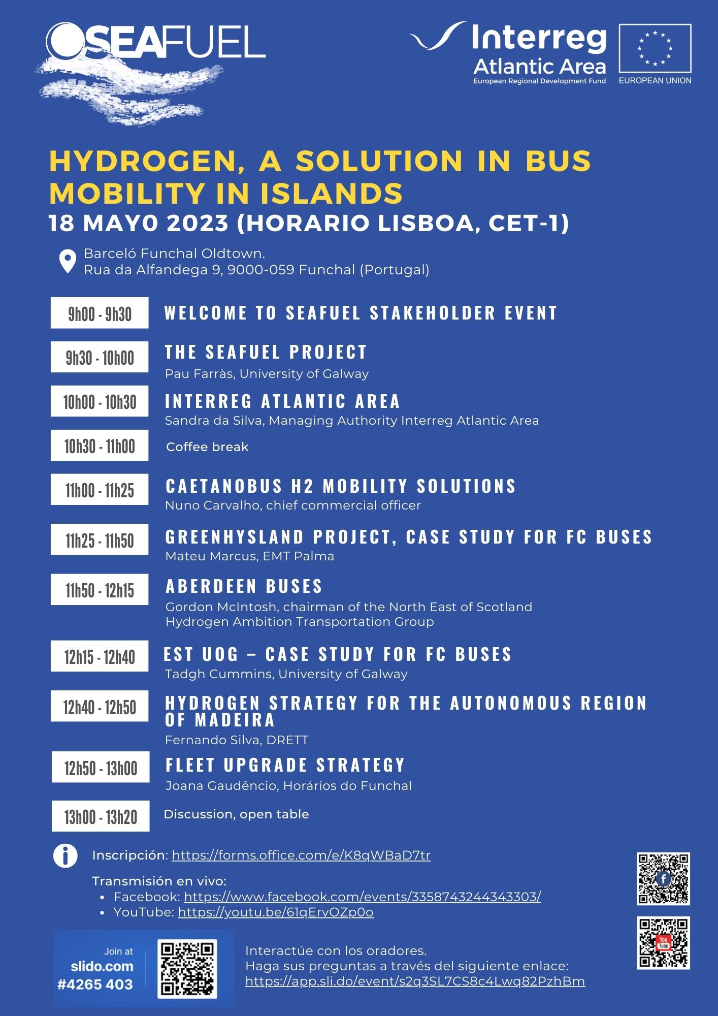 Como parte del proyecto SEAFUEL, el seminario «Hydrogen, a solution in bus mobility in islands» se celebrará el día 18 de mayo a las 9:00h (hora local) en Funchal, Madeira (Portugal).