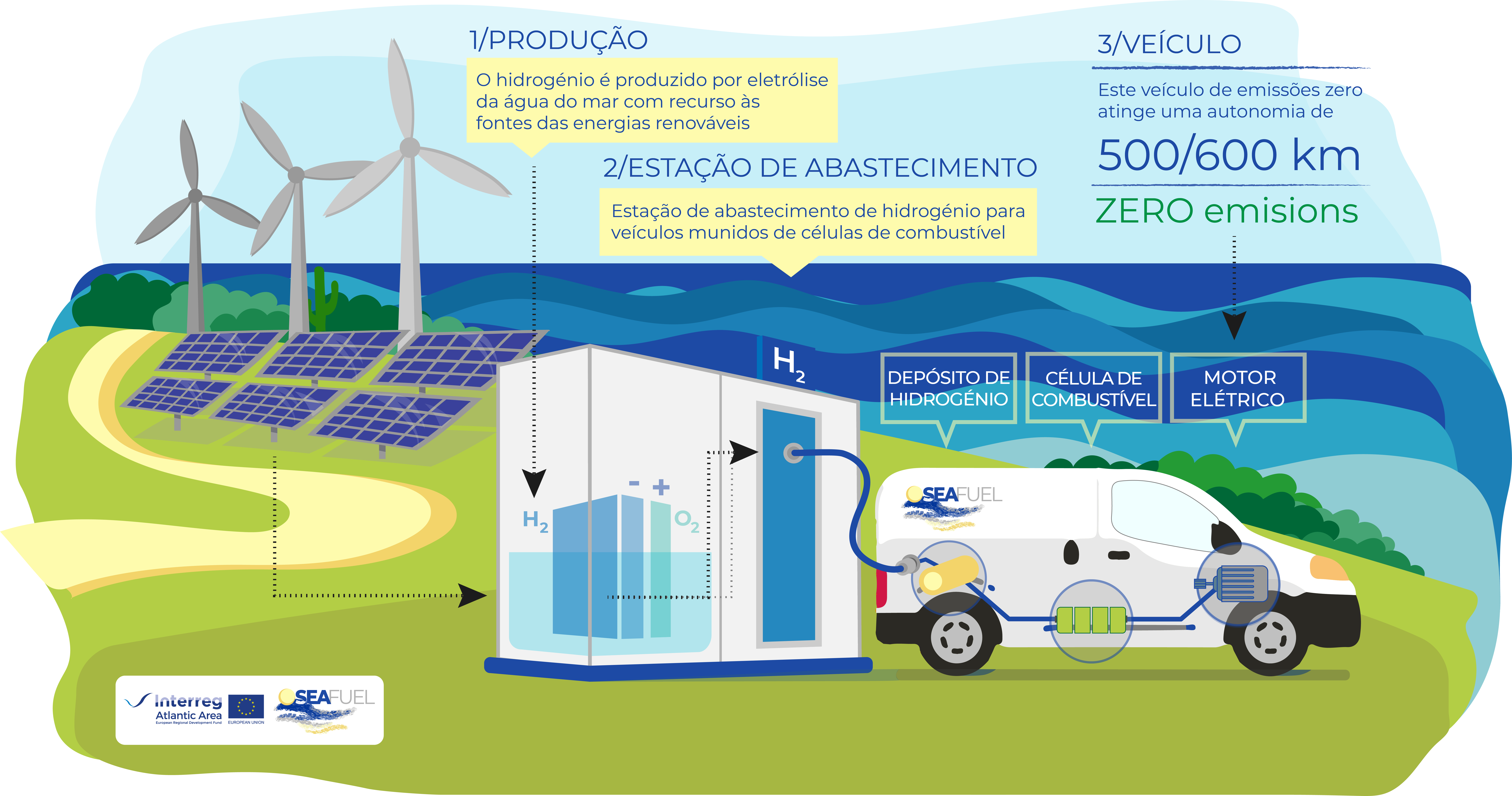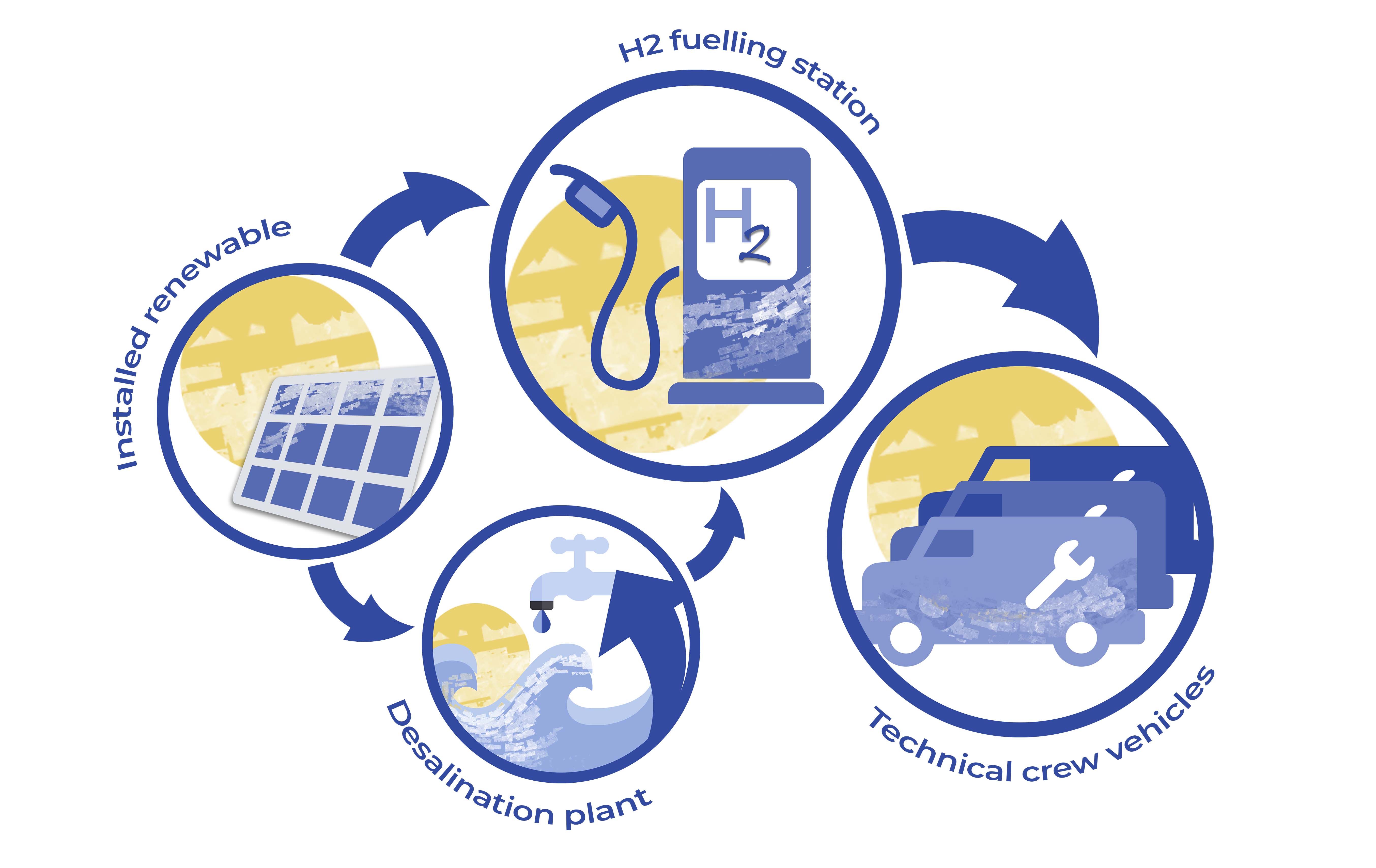 A nossa abordagem inovadora baseia-se na conexão da estação de abastecimento de hidrogénio aos painéis solares fotovoltaicos, às turbinas eólicas e à energia oceânica para a produção de combustível com base na disponibilidade dos recursos energéticos renováveis.