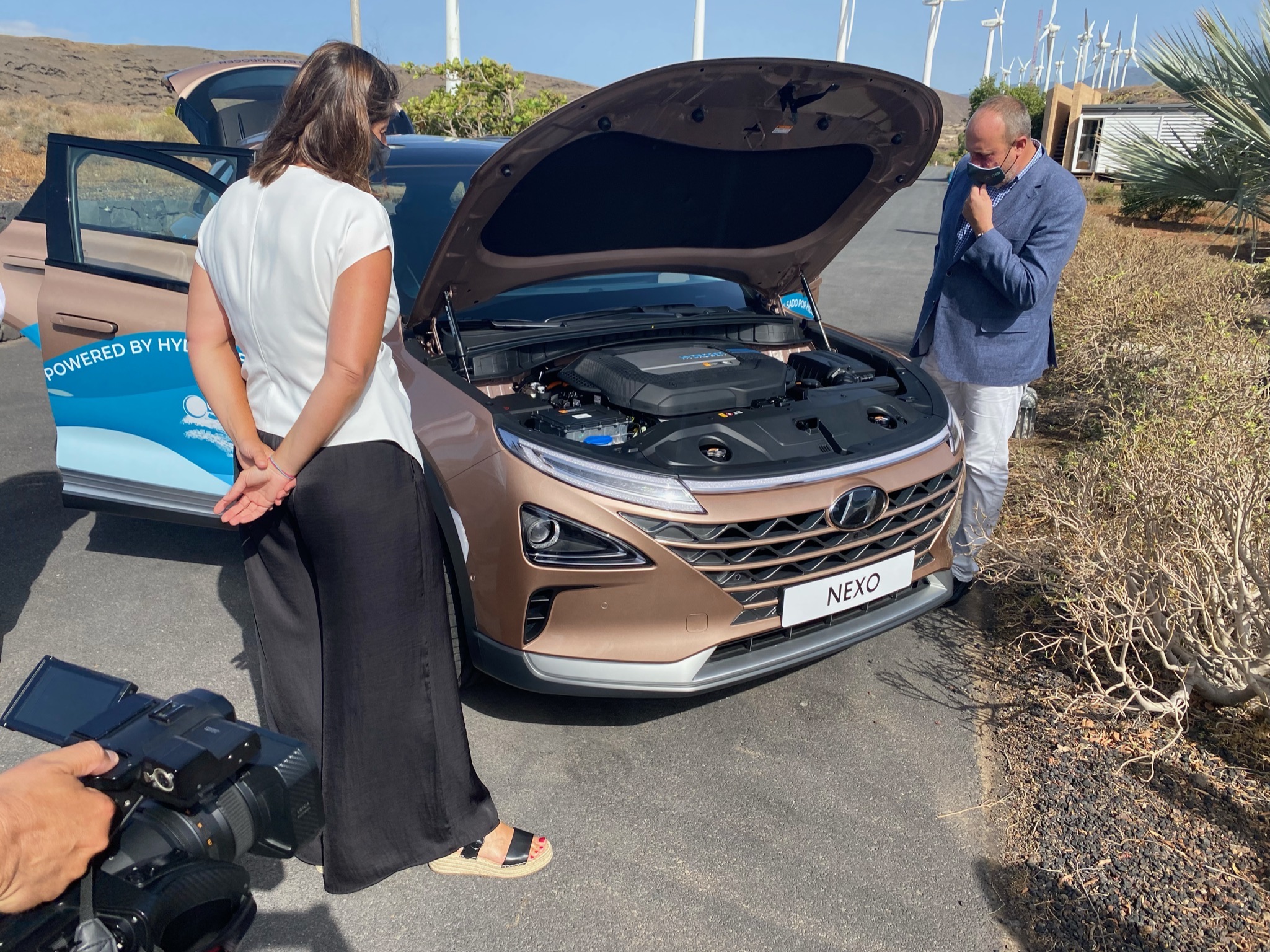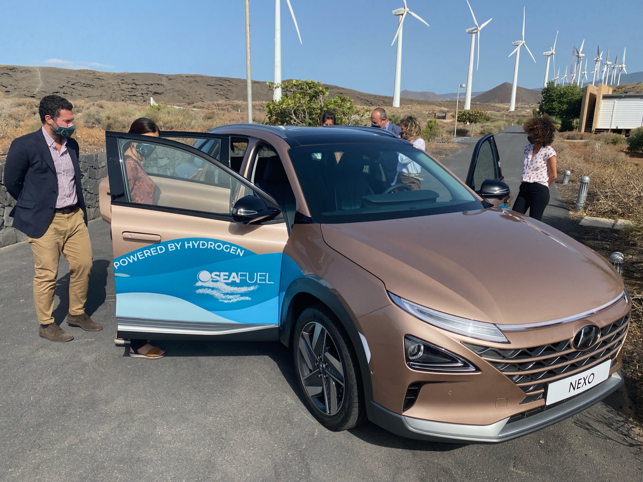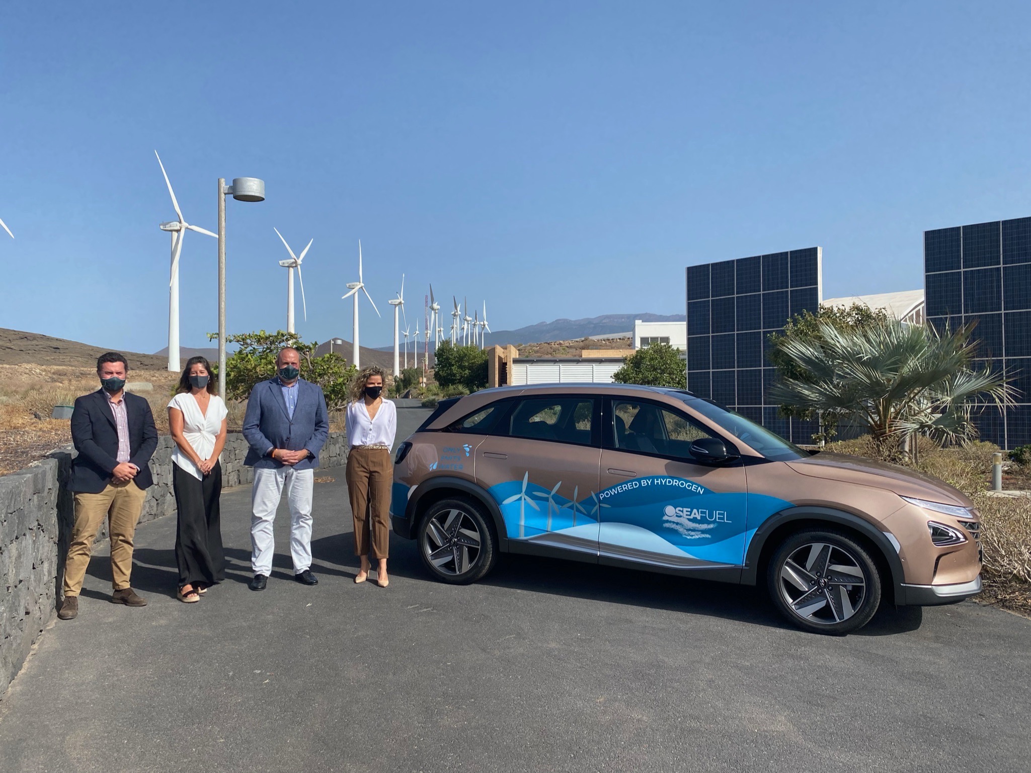 The partners and associate partners in the Canary Islands of the European project SEAFUEL, the Institute of Technology and Renewable Energies (ITER), the Tenerife Energy Agency (AIET), the Cabildo de Tenerife and Hyundai Canarias, presented yesterday the first fuel cell vehicle of the SEAFUEL fleet. The Hyundai Nexo, the first to arrive, together with the other 7 SEAFUEL cars will demonstrate the viability of using sustainable hydrogen in transport by supporting the shift towards a low-carbon economy. The event, which took place at the ITER facilities, was attended by the first vice-president and director of the Island of Innovation, Enrique Arriaga, and the CEO of Hyundai Canarias, Irene Gálvez, as well as the CEO of ITER, Eduardo Ballesteros, and the project manager of the Tenerife Energy Agency, Elsa López.